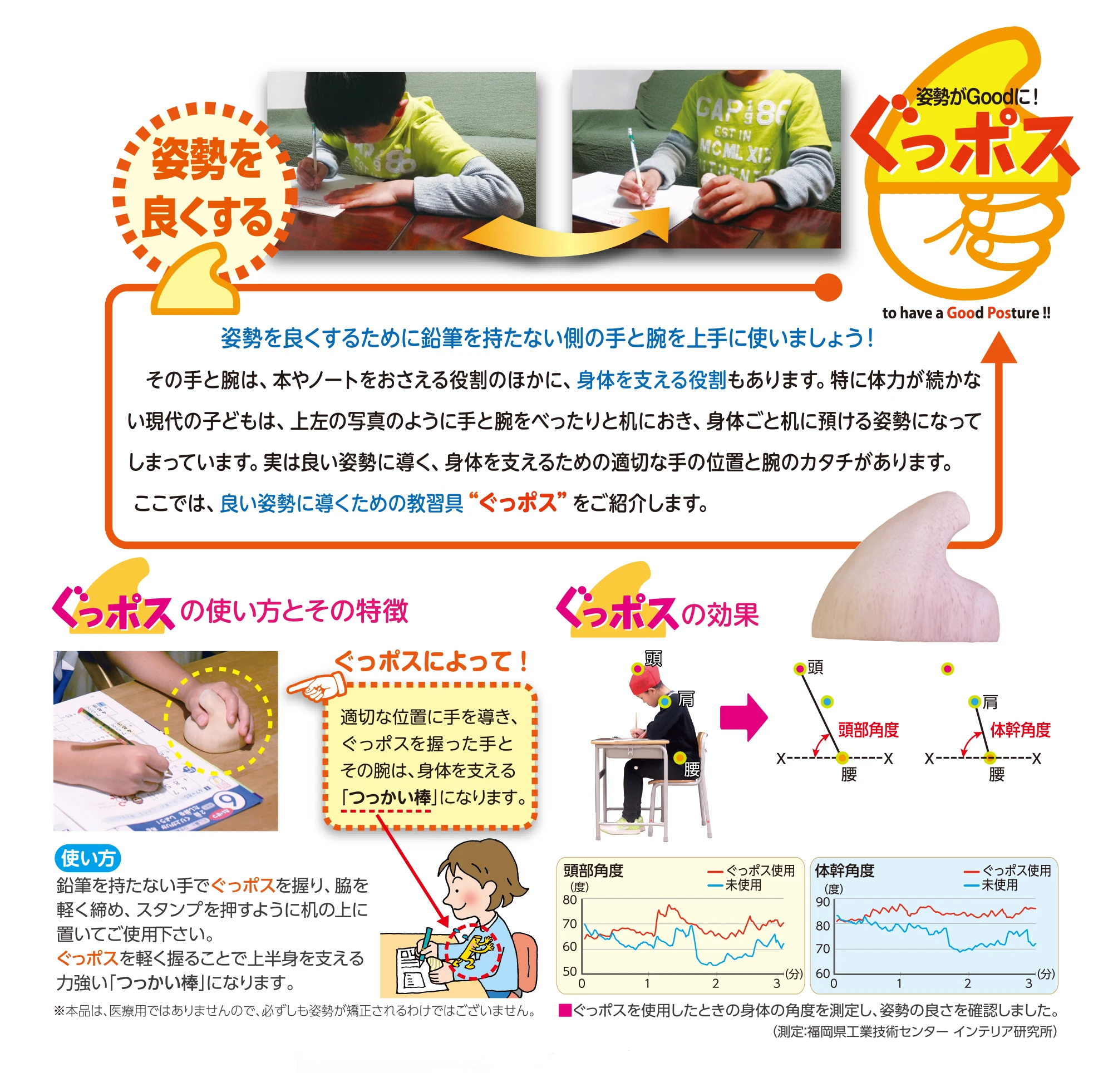 姿勢を良くするためには鉛筆を持たない側の手も大切です。 上半身を支える力強い「つっかい棒」になる『ぐっポス』プレゼント中!